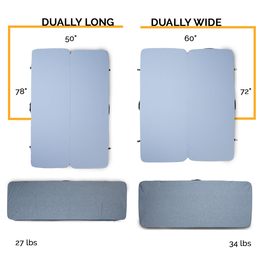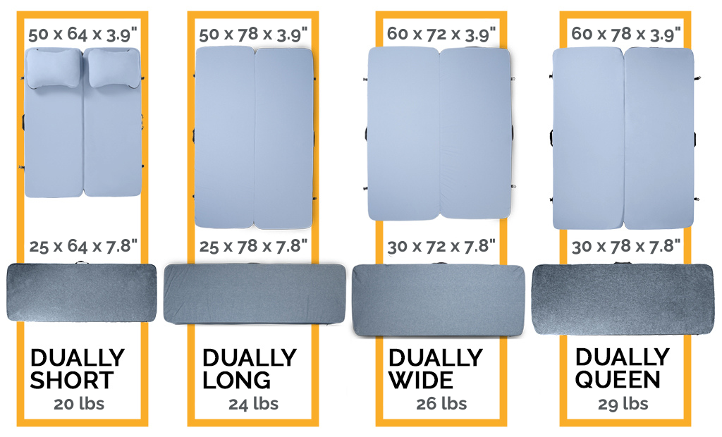 Before buying a HEST mattress we recommend measuring the width and length of your sleep space first to verify fit. Our mattresses are 100% memory foam and can squeeze into most spaces if they are slightly bigger. Even if a mattress is 3 - 5 inches too wide or long for your space, it most likely will still fit and be comfortable. For example if the wheel wells of your truck bed are in the way, the Dually will form around the wheel wells to fit the bed. Or if the mattress is too long for your truck bed, the extra couple inches can curl up to make an extra head rest/cushion. One of the nice things about memory foam is that folding/bending/or squishing the mattress won't affect its sleep performance.
